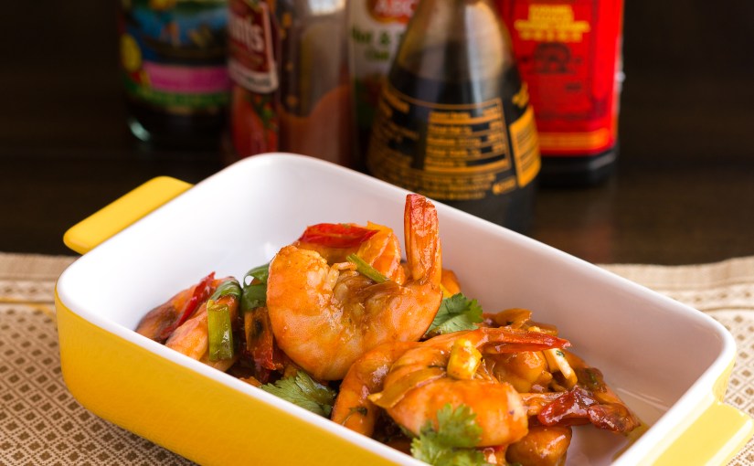 In a wok or pan on medium-high heat, add 4 tablespoons oil, and fry garlic, ginger and chili for 1 minute or less until aromatic and slightly golden brown. Add the shrimp, and stir them for 1 minute or until they appear just cooked on the exterior. When cooked, lower flame to medium-low.